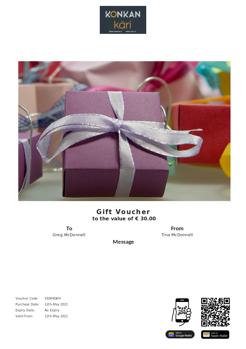 Konkan Clanbrassil Street, Konkan Dundrum, Kari Inchicore allows you to purchase instantly printable gift vouchers, special offers and tickets using the Voucher Connect platform.